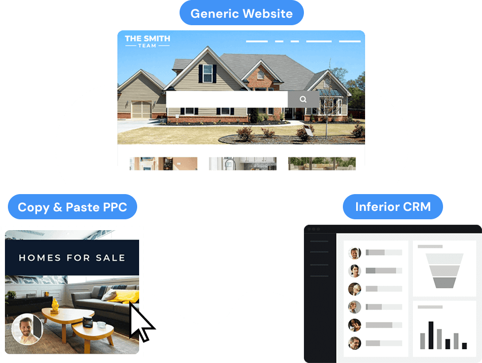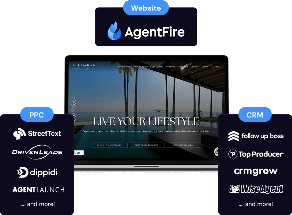 TRIO allows you to combine an AgentFire website with your choice of PPC and CRM. If you don’t have a preferred PPC partner or CRM, book a demo with us, share your goals and budget, and we’ll recommend the perfect TRIO setup tailored for you!